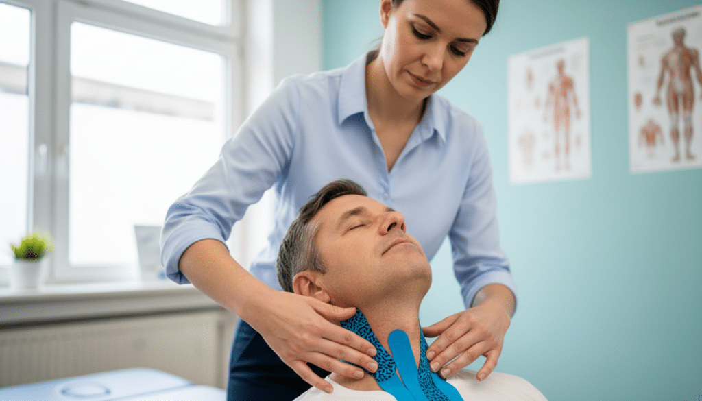 Kinesiotape, auch bekannt als medizinisches Tapen oder dynamisches Tapen, ist eine Therapiemethode, die ursprünglich in Japan entwickelt wurde. Es handelt sich um elastische Klebebänder, die auf die Haut aufgebracht werden, um verschiedene physiologische Prozesse im Körper zu beeinflussen. Bei Beschwerden der Halswirbelsäule zielt die Anwendung von Kinesiotape darauf ab, Schmerzen zu reduzieren, die Muskelfunktion zu verbessern und die Beweglichkeit zu unterstützen.